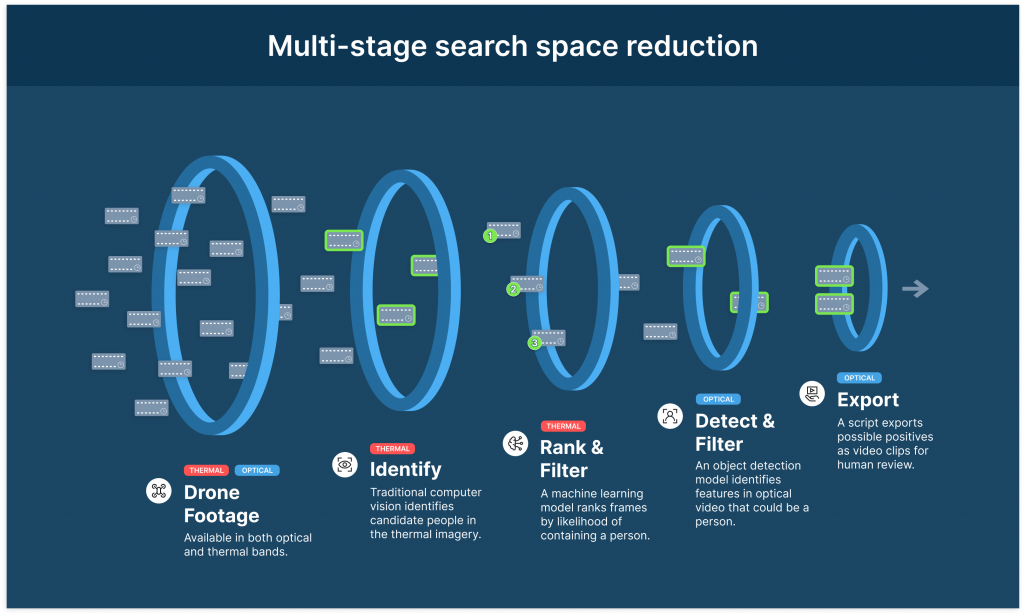 Given the hardware limitations of the Snowcone, running hours of drone footage through a machine learning model would be prohibitively time consuming. Instead, we adopt a two-stage approach where the video is first cut down (to the bits most likely to contain humans) by a light-weight model using thermal imagery and then further refined by a larger object detection model using optical imagery.