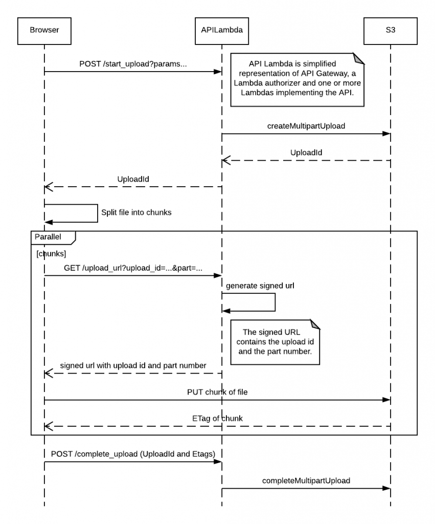 The example code and my diagram above upload all of the parts of the file in parallel. Large files can result in too many concurrent uploads for the browser to handle. You should limit the number of parallel uploads by only uploading a set of the chunks at a time to S3. 10 concurrent uploads worked without issue but still provided reasonable upload times. Do your own testing to see what works for your use case.
