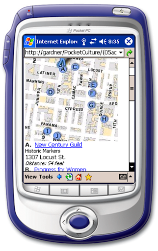 In a related effort, we bought developer versions of Google Glass for Mike and Kenny, who demonstrated how both historic photos and other city data could be overlaid on our visual experience as we walked through a city.