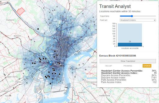 Some of our colleagues apply their 10% time to developing new tools for nonprofit organizations. One recent example was TransitAnalyst, a collaboration between Kathryn and Mike that used open federal data sets to create an online application that combined public transit data with housing and economic data to help communities understand where critical resources are located relative to transit access.