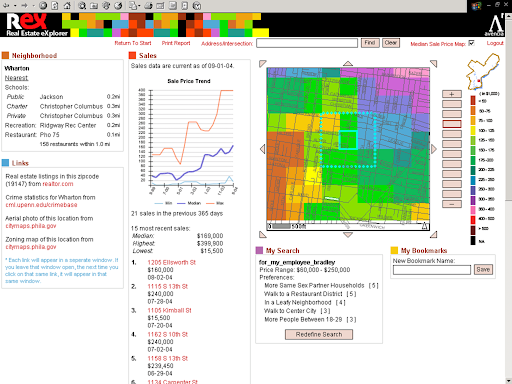 The O.G. Azavea 10% time effort was a project called Rex, a real estate search and metrics tool (hat tip to colleague, Steve, who originally suggested the 10% time idea to me back in 2003) . This project provided a way for people to combine data about the real estate market with a mechanism for prioritizing the types of places they’d like to live. It required us to develop two innovations: 1) a way to project likely home prices based on recent market sales; and 2) a way to perform very fast raster data processing in order to prioritize the best locations.