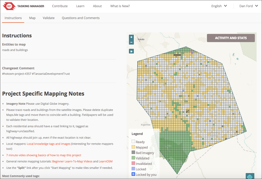 Tasks are prioritized in the HOT Tasking Manager. You can view a list of active project areas, information about the requesting NGO, and descriptions of the project needs.