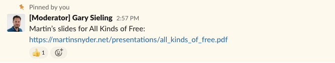It’s also worth noting that it’s harder to police behavior in a Slack workspace that isn’t sponsored by your own employer–in a work situation, you have HR and social pressure as an enforcement mechanism.
