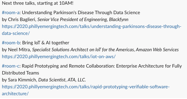 We used three tools heavily–HeySummit, Slack, and Zoom webinars. Each “room” in the typical conference space was a channel in Slack–I moderated one track. A few people reported technical issues (e.g. their employers blocking collaboration tools), but the committee and attendees come up with good workarounds to these. For example, attendees figured out how to update published links to Zoom to versions that worked on the web without the installer.