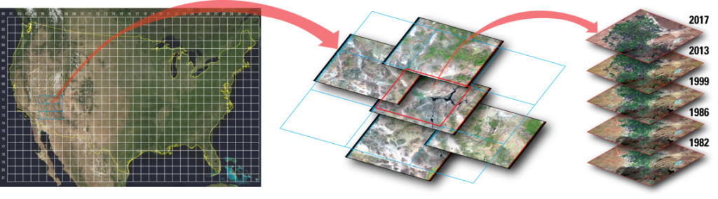This facilitated the creation of time series without any additional processing, since a single pixel was a fixed location and size through the entire Landsat archive, allowing users to treat all the Landsat satellites as a single “virtual” constellation. As opposed to real constellations where multiple satellites carrying equivalent instruments are operated together as part of a single mission (e.g., Aqua and Terra MODIS instruments, Planet Doves), the Landsat ARD product is an effort to harmonize data from across similar types of instruments.