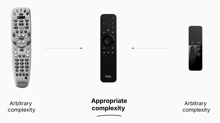 When it comes to television remotes, for example, different brands have run the gamut of over and under-simplified designs, neither of which are functional for users at their extremes. While a super simplified remote may fail users because it adds unnecessary clicks, a remote with 56 buttons has a lot of unnecessary actions that users may never actually use. A streamlined and intentional design, even one that is not flashy or particularly unique, represents an important concept known as appropriate complexity.