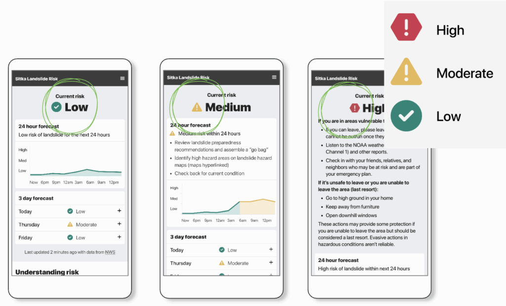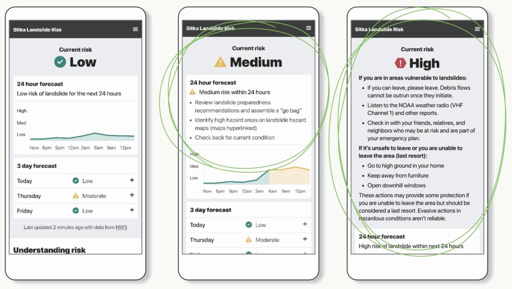 In the case of the Sitka Landslide Risk App, our user’s job was essentially just to stay safe – it isn’t their job to check the risk. Further, when we begin to consider the level of risk itself, the users’ job of staying safe doesn’t change. That said, the actions they will need to take in order to maintain safety do change dramatically based on risk level.