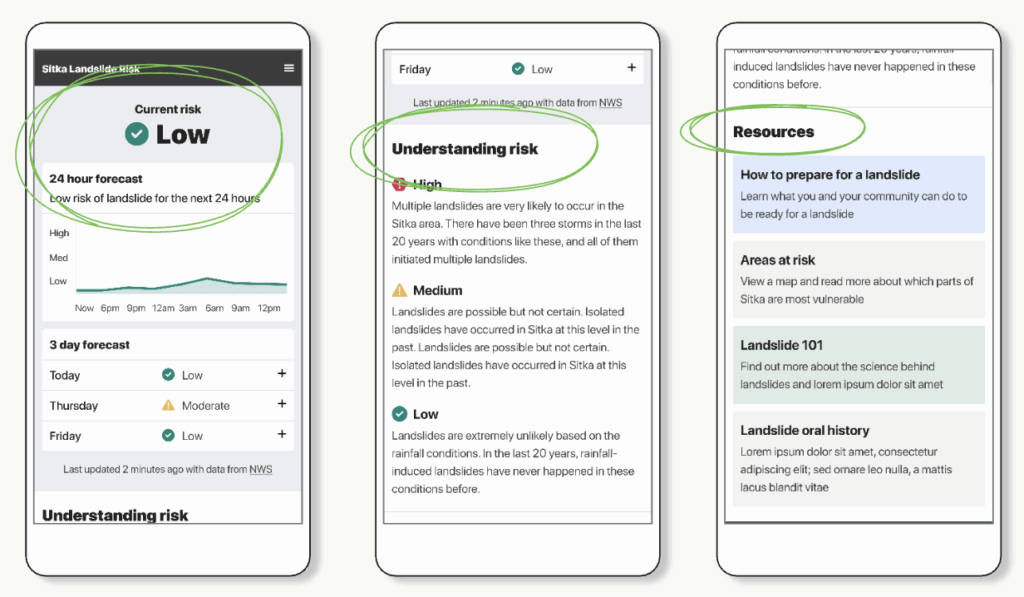 Sometimes, it’s easiest to see design principles through examples. The following case study demonstrates key strategies for implementing appropriate complexity. This project was undertaken after a series of deadly landslides hit Sitka, Alaska. In response to these natural disasters endured by the affected community in Sitka, the driving goal behind the application is to save lives and to further landslide safety. The work was spearheaded by the Sitka Sound Science Center, but involved collaboration with tribal groups, RAND Corporation, and several universities.