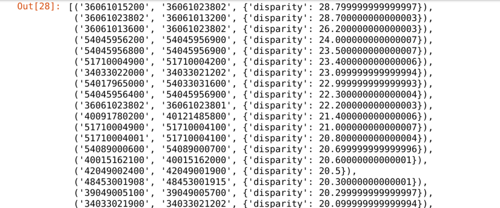 After populating our graph, we only need one line of code to find all tract neighbor pairs and sort them by the disparity in life expectancy between the two.