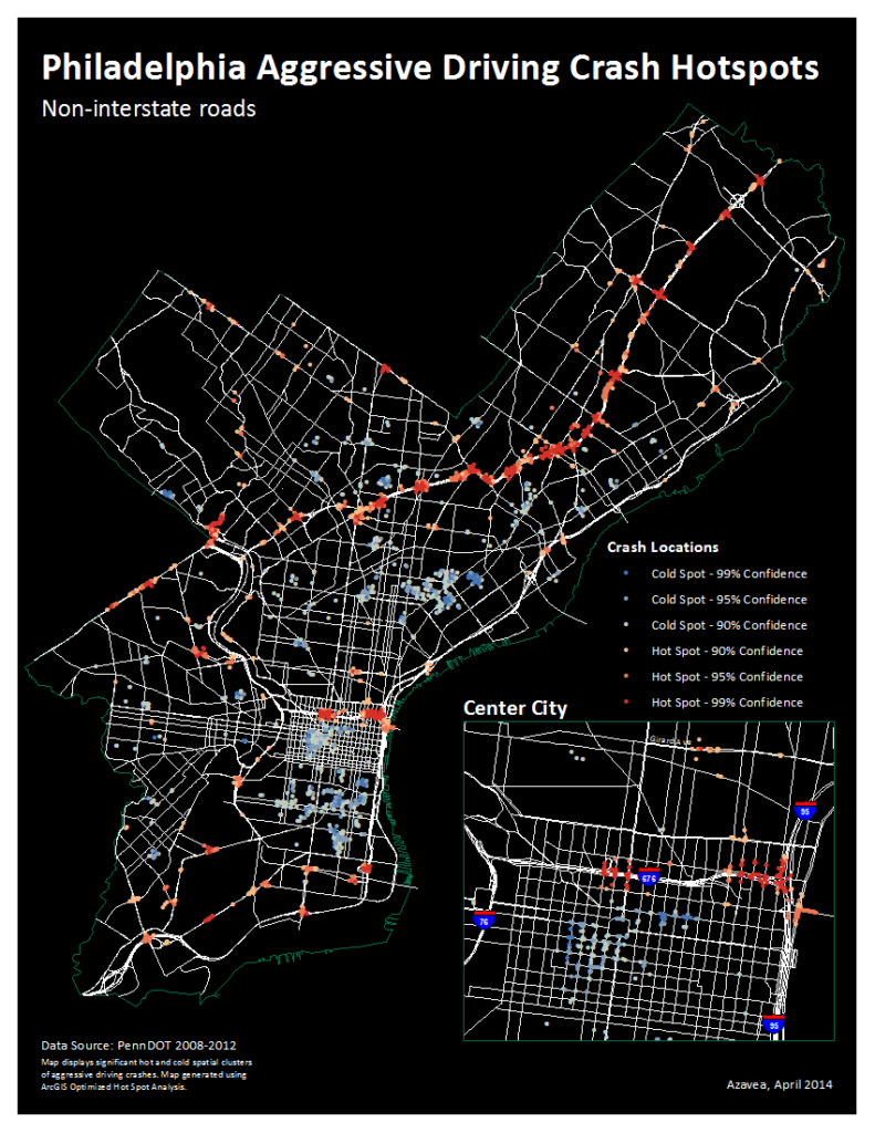 Note on the map above the clusters of hot and cold spots for aggressive driving. The crashes that are not statistically significant are not displayed on the map. Aggressive driving crashes cluster along Roosevelt Boulevard, well-known for its dangerous conditions. Other hot spots appear along City Line Avenue along the western border of the city. There also seems to be quite a bit of hot spot clustering around interchanges along Interstate 676 and the Ben Franklin Bridge. Jon Geeting hypothesizes that this is the result of traffic coming off the interstate and not adjusting to the slower city streets. It’s also interesting to look at the cold spots, or where aggressive driving crashes show a significant level of dispersion. That can be seen in Chinatown, Center City West/Rittenhouse area, and the East Passyunk neighborhood — specifically right along the 9th street market. All three areas have high amounts of pedestrian activity, slower traffic speeds and lots of mixed-use. Could that be a deterrent to aggressive driving?