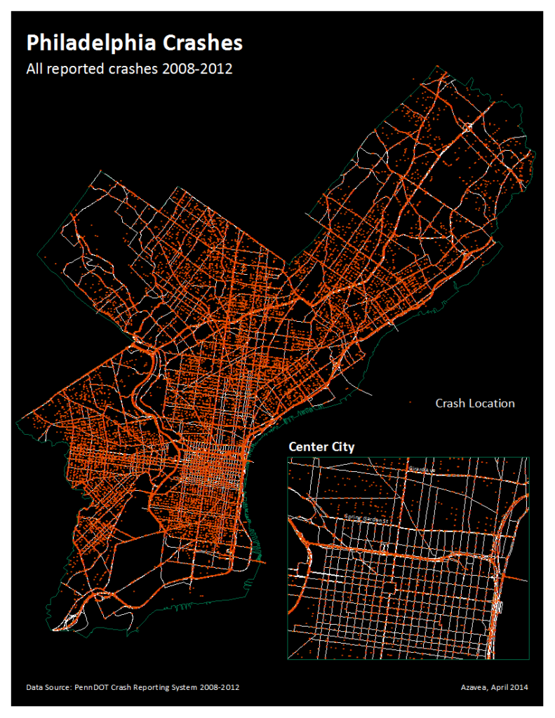 This type of crash analysis had never really been done in Philadelphia, at least with the results available to the public. It generated the interest of some of the city’s civic-minded journalists, including blogger-extraordinaire Jon Geeting. Jon contacted Azavea with the idea to do this analysis on all crashes in Philadelphia — with a specific interest around aggressive driving and pedestrian-affected incidents. We typically think of crashes as “accidents”. Jon’s hypothesis, and one that receives large favor in the planning sphere, is that these crashes aren’t really accidents at all. They can be a direct consequence of how our streets are designed. Therefore, if planners can design our streets in a way that favors lower speeds (traffic calming as it’s referred to) and accommodates all kinds of travelers (bicyclists and pedestrians as well as cars), perhaps the crash rate can be reduced. I’ll leave that analysis up to Jon, and you can read some of it here, here and here.