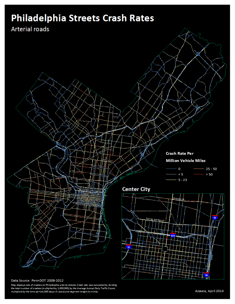 Our first opportunity to work with crash data was last summer during our 2013 Summer of Maps Fellowship. Tyler Dahlberg, our fellow working with the Bicycle Coalition of Greater Philadelphia, analyzed bicycle crashes in Philadelphia from 2007-2012. The results of his analysis showed bicycle crashes clustering around some of the wider streets in the city — Market Street, Broad Street and Spring Garden to name a few. Any bicyclist in Philadelphia will tell you these are not their favorite places to ride a bike. Tyler also looked at aggressive-driving related bicycle crashes and found significant clustering in University City, specifically around the 38th street area.