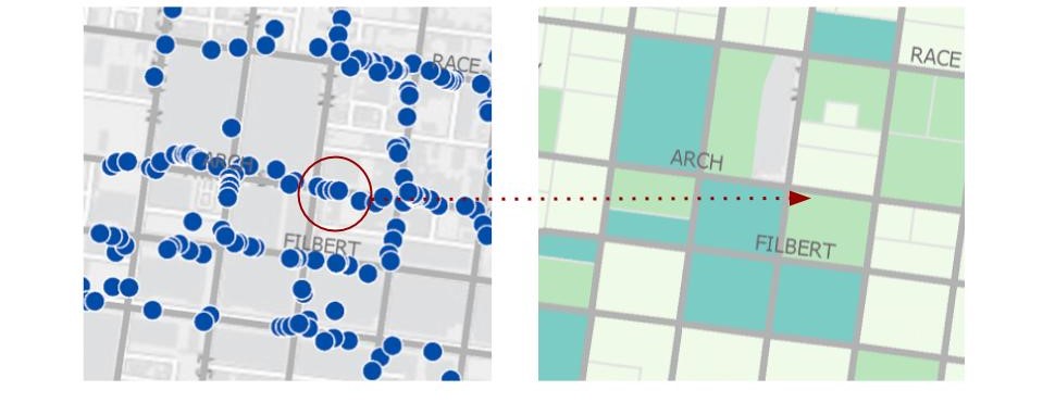 The points will be aggregated to the blocks they locate within. In this way, the bike parking demand prediction will be as precise as blocks.