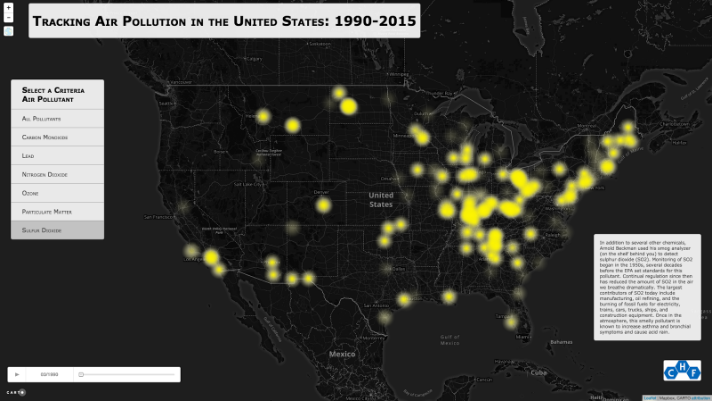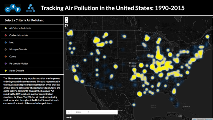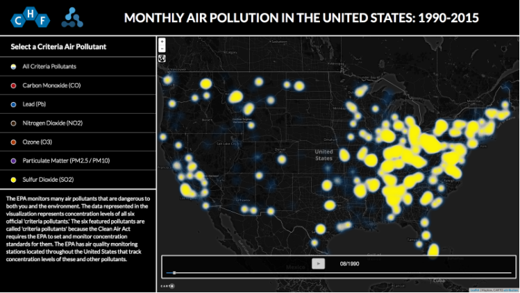 The Chemical Heritage Foundation (CHF), a science education non-profit based in Philadelphia, applied for the Summer of Maps for help designing an interactive web application displaying the distribution of air pollution in the United States from 1990-2015.