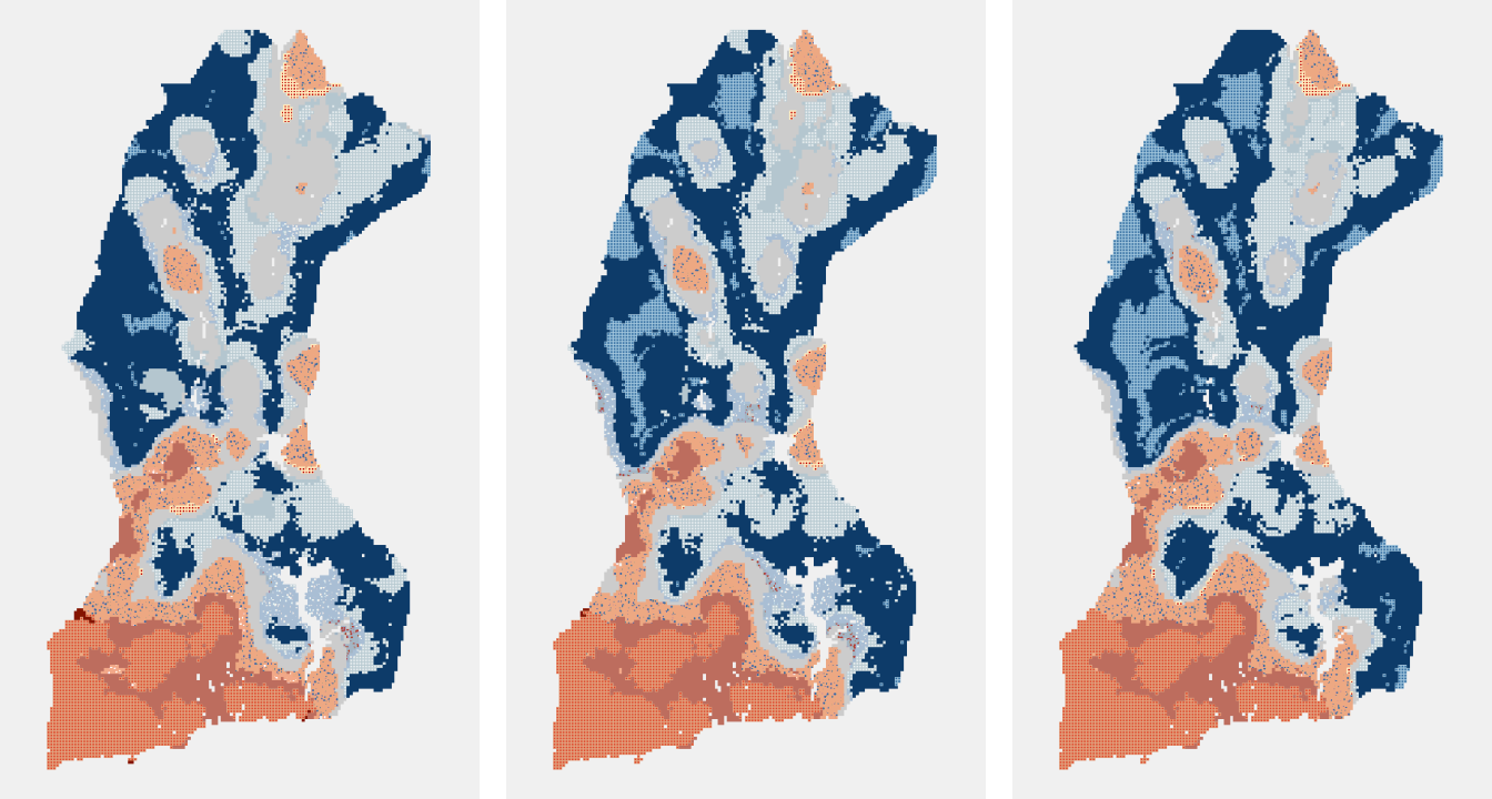 Each of the three emerging hot spot results below had all of the same inputs except for the Neighborhood Distance. A distance of 10 kilometers (left) creates a map with many small pockets of variation across space as each bin is only compared with others within 10 kilometers of it. A neighborhood distance of 20 kilometers (center) results in map with large contiguous hot and cold spot areas, and a neighborhood distance of 30 kilometers (right) creates even larger clusters of similar categories.
