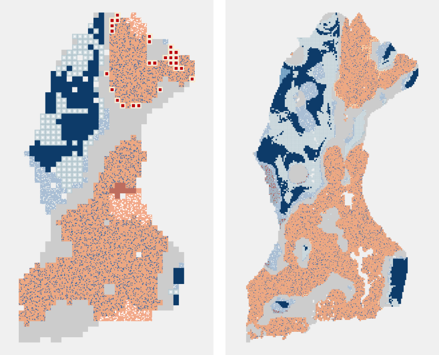In the case of my analysis, there was no obvious interval to choose so I experimented with different distances to find one that revealed patterns over the study area. Two example results below from emerging hot spot analyses I conducted illustrate the effect of the distance interval. A 10 kilometer distance interval, shown on the left, is too large for point aggregation and obscures complex patterns in the landscape that are evident with a distance interval of 2.5 kilometers, shown on the right. Choosing a distance interval that is too small will result in many bins having zero point counts, making it difficult to assess clustering of hot and cold spots.