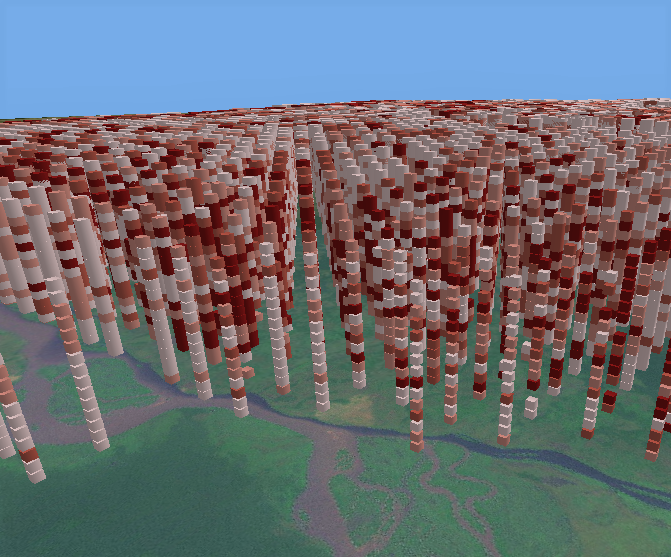 Above is a space time cube of forest fire occurrence visualized in 3D. Each column of stacked bins represents a time series of fire events with the most recent year on the top. In this example, bins have been symbolized to represent the count of fire events per bin. Darker red bins had higher counts of fires and lighter bins had fewer fires.