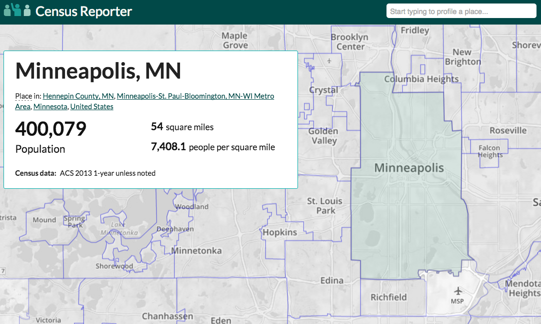 Let’s start with Profile. Type Minneapolis, MN into the Profile search box. You’ll see multiple results come up. CensusReporter will return each geography that contains a place. So we see one result for Minneapolis the place and one for Hennepin County. Choose Minneapolis, MN the place. Check out the map near the top after you’ve made your selection: