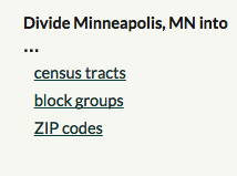 What we want to see is population by Census Tract. On the Table page, look at the lefthand tab. Near the bottom, there is a heading entitled “Divide Minneapolis, MN into…”