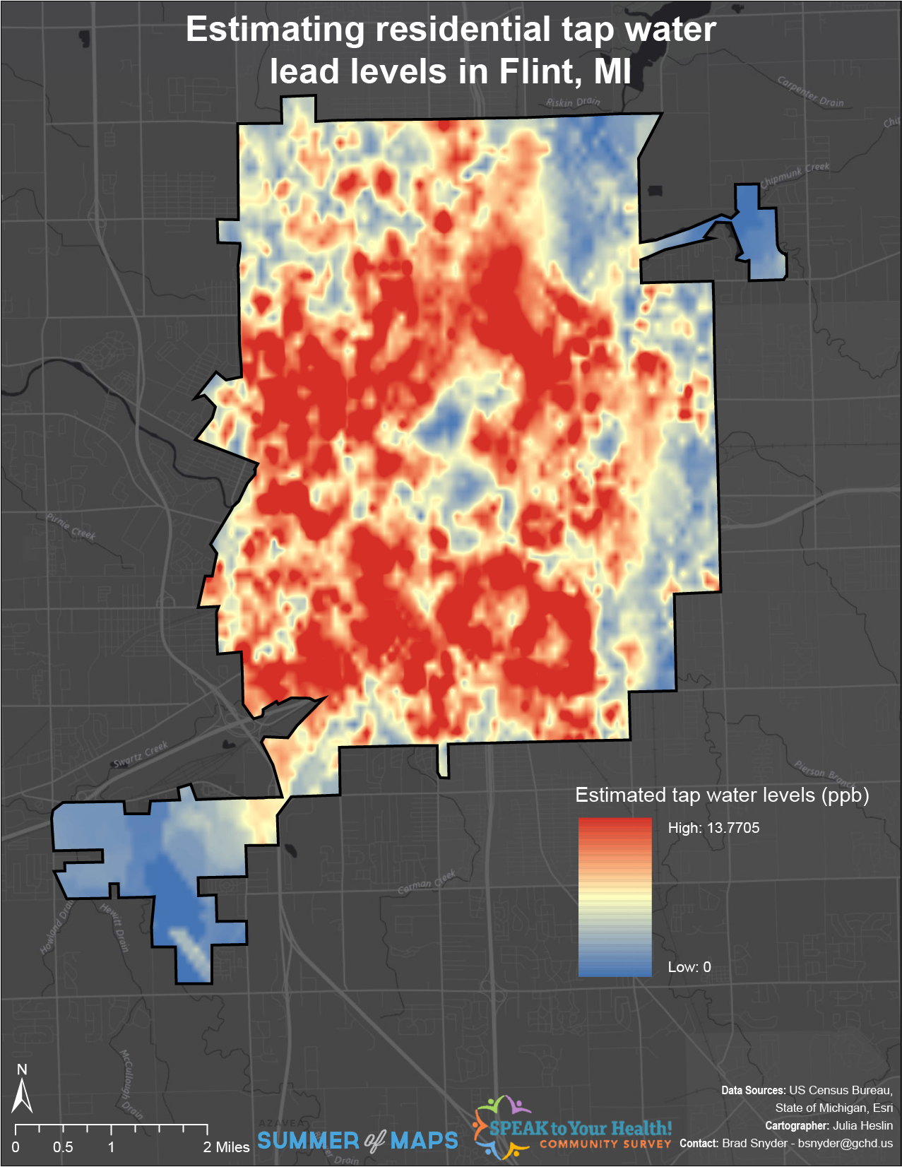 I had the opportunity to share the results from this analysis along with the other analyses conducted for this project at the Speak to Your Health! Community Survey committee meeting in Genesee County. Just before attending the meeting, our point person requested that I estimate the lead levels in tap water based on respondents’ addresses.