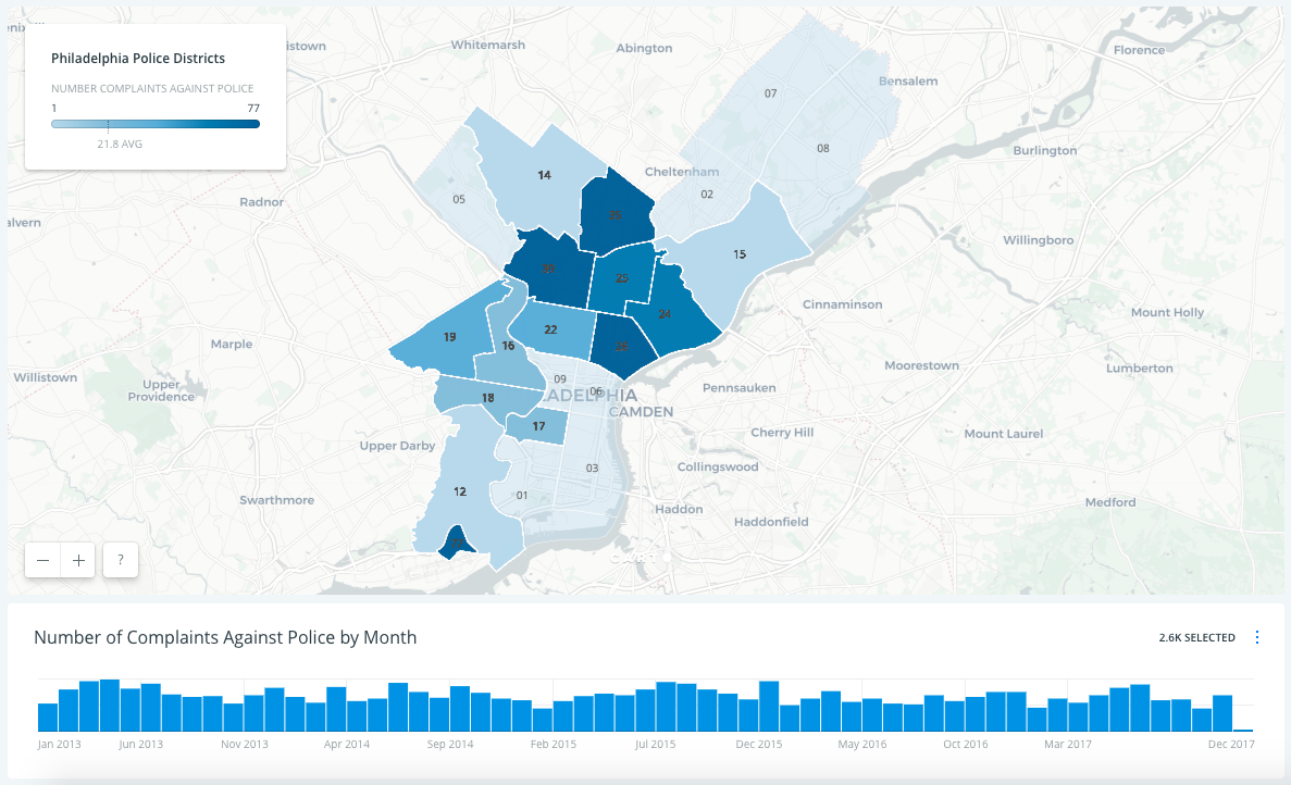 In 2013, Mike Ball built a map that enables users to interact with detailed information on Philadelphia Police Advisory Commission Complaints 2009 – 2012 data. This resource made it possible to investigate potential geographic patterns in the data.