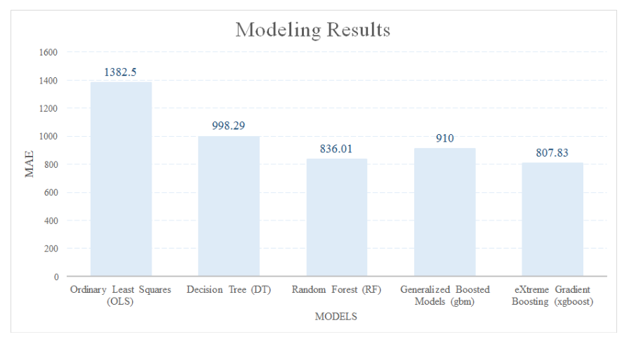 This blog is an exploratory example of using machine learning models to solve unbalanced dataset problems in real projects. The MAE of the five modeling approaches used in this analysis is shown in the chart below. Although xgboost has the best result with the MAE of 807.83, it does not indicate it is always the best modeling approach for any dataset. Trying all the machine learning models is still the best way of selecting the best modeling approach.