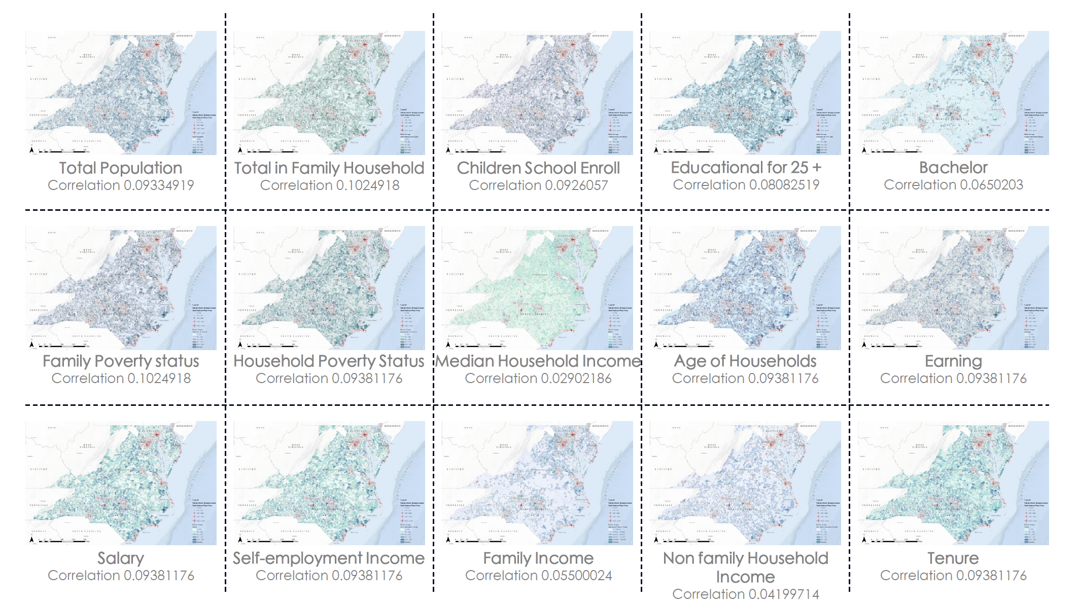 Here is a matrix showing all the Pearson correlation coefficients between the dependent variable, Pounds of Marine Debris (Pounds), and all the social-economic independent variables. The Pearson correlation value is only an indicator of the linear correlation between variables. As we can see in the image below, the correlation is not really strong, therefore, the generalized linear models might fail in describing the underlying spatial pattern of marine debris.