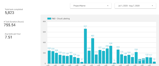 The main metrics you’ll need to give a completion date for a project are the average number of hours spent labeling and validating per day/session and the average number of tasks labeled and validated per hour. I find that separating labeling and validating provides a more precise estimate, but is not essential for an accurate assessment. You’ll then divide the number of outstanding tasks by these figures to deliver an estimate in hours and days until project completion. Each day your labelers spend working on the project will improve your estimate.