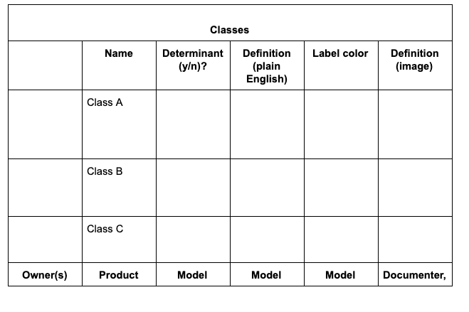 Once the project’s goals are established, it’s time to define the classes. To ensure consistency and clarity, I like to develop a chart like the one below to capture all relevant information about each class:
