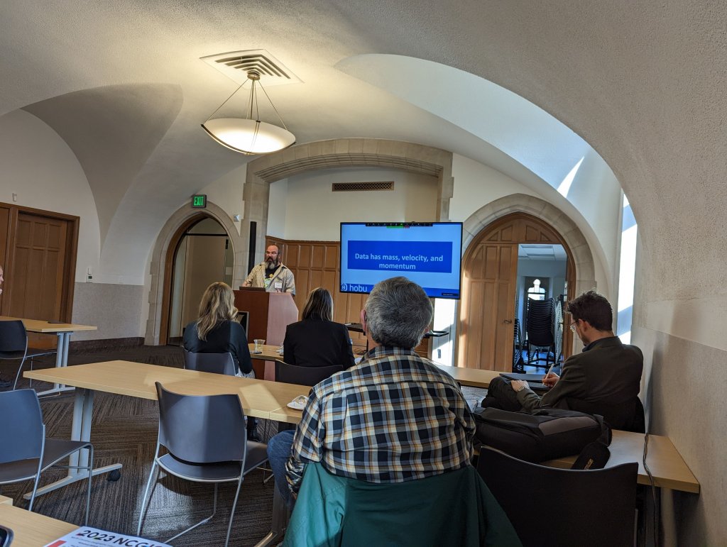 - Howard talked about how data has gravity. Once a certain amount of data lives in a certain (cloud) location, it gets harder and harder to move it, and it attracts more and more computing nearby. This means that data storage decisions are crucial, especially when picking the format and layout of those data. Cloud-optimized formats can provide huge amounts of value just by existing, since they’re well organized and addressable by intellegant toooling.