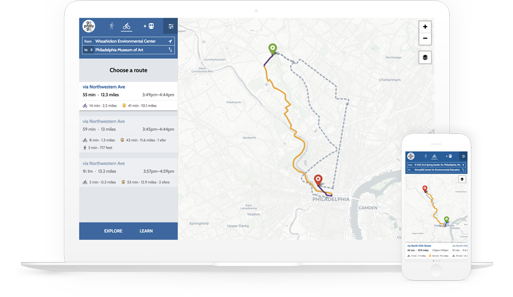 GoPhillyGo is a custom web application that makes it easy for users to plan multimodal routes that combine biking, walking, and public transit options.