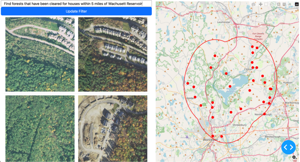 Queryable Earth demonstrates text-based search across satellite imagery using a vision-language model and LLMs. Users can search for specific infrastructure or geographic features by converting their text queries into vector embeddings that match against pre-indexed Massachusetts imagery. The system leverages the model’s ability to understand both natural language descriptions and satellite imagery features, enabling intuitive exploration of geographic data.