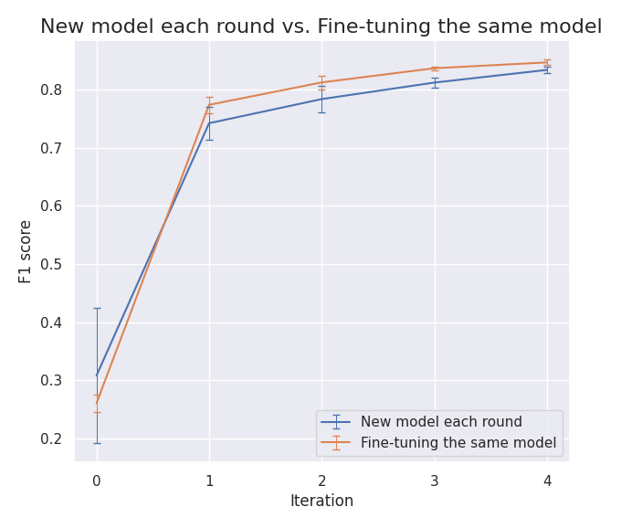 Training a new model each round vs. fine-tuning the same model