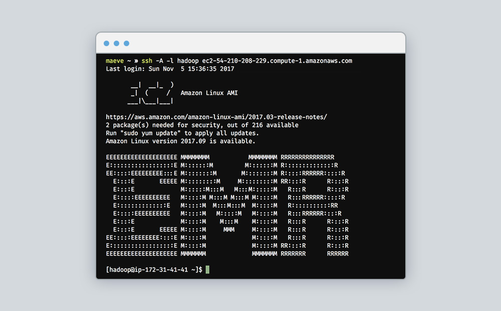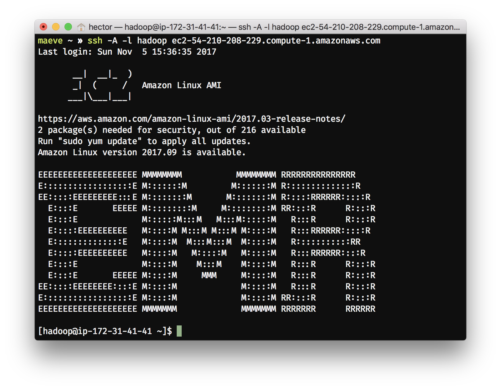 $ ssh -A -l hadoop ec2-54-210-208-229.compute-1.amazonaws.com [hadoop@ip-172-31-41-41 ~]$ yarn node -list | grep "Total Nodes" Total Nodes:2