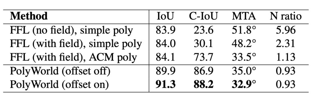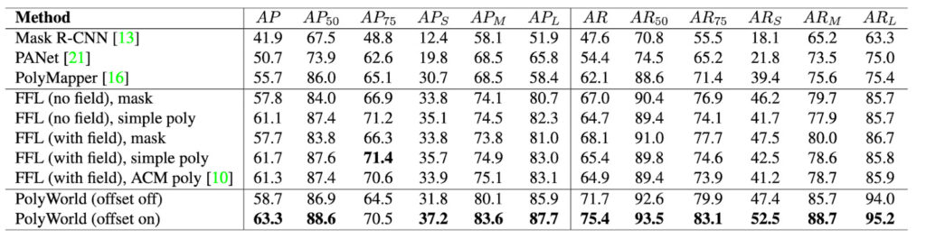 Here, we briefly summarize experimental results from the PolyWorld paper which compares the performance of PolyWorld to instance segmentation baselines, PolyMapper, and Frame Field Learning. The models were evaluated using the test set of CrowdAI using the various metrics described above. Overall, PolyWorld performs better than the other methods on most metrics, and the instance segmentation baselines perform the worst. These results are listed in the tables below.