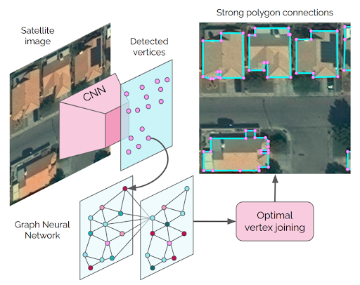 The final model we review, PolyWorld, was published at CVPR 2022 by Zorzi, Bazrafkan, Habenschuss, and Fraundorfer [3]. This model predicts polygons end-to-end and consists of a CNN to extract vertices, a graph neural network to refine the position of these vertices, and an “optimal connection network” to prune, group, and sequence the vertices into polygons.