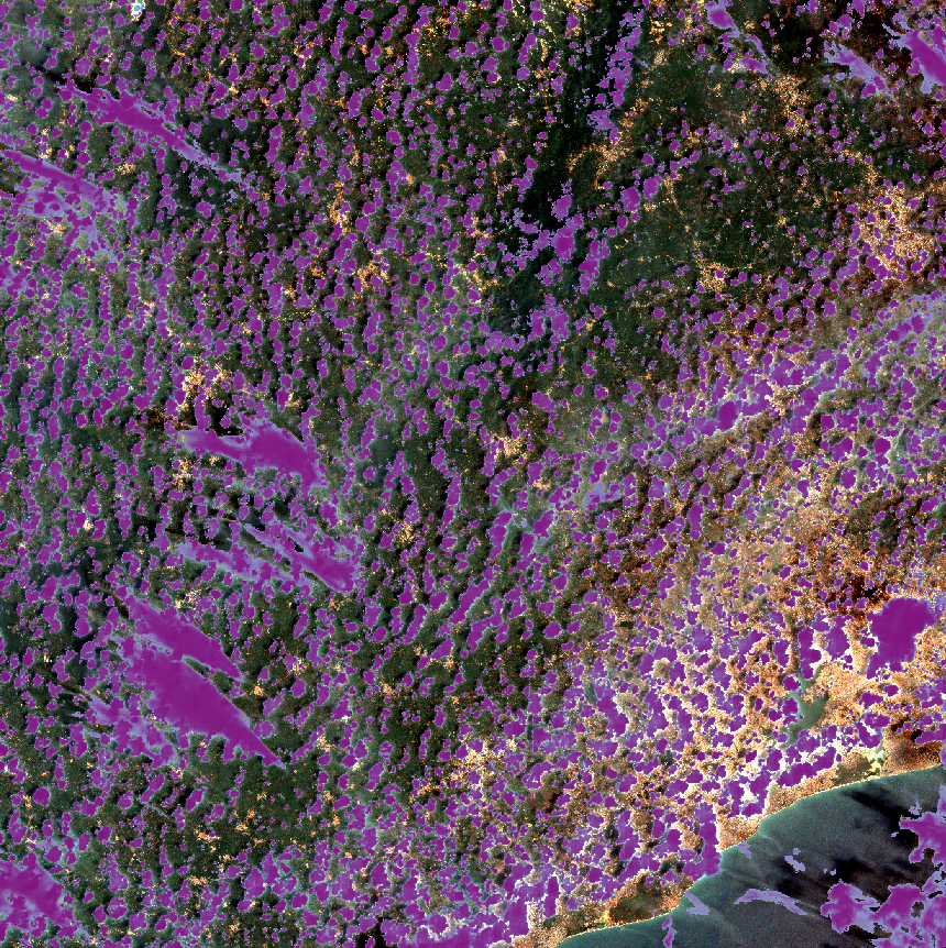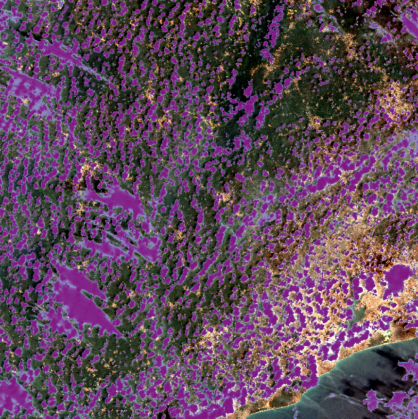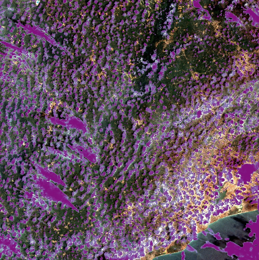 By contrast, CheapLab is a shallow architecture that seeks to capture (be able to represent) the family of functions that includes standard normalized indices such as NDWI, NDCI, NDVI, et cetera. CheapLab has the advantage of not needing an explicit, prescribed threshold to distinguish between a positive (foreground) response and a negative (background) response as NDWI and the rest do. For CheapLab, that cutoff is fixed implicitly by the training procedure.