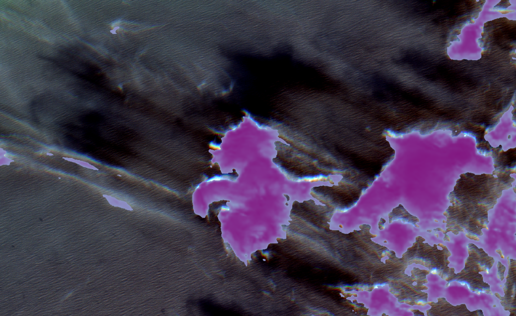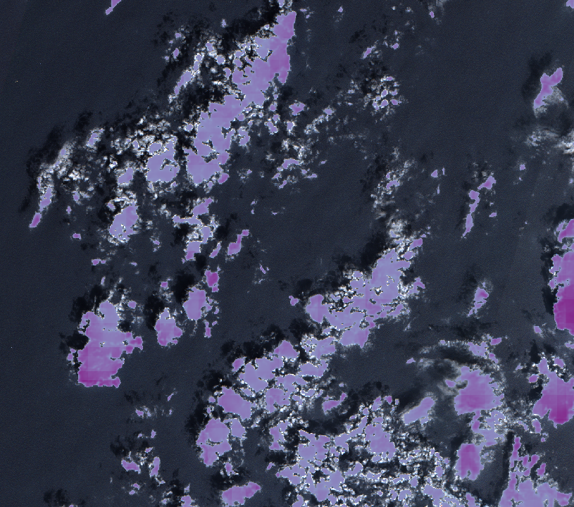 This image contains only a few wispy clouds. Both model types manage to detect the clouds, though the entire area of the wispy cloud in the upper-left is seemingly not covered by either. The CheapLab models seem to generate a few (possible) false positives in the right half of the image. The overall level of pixel intensity is much greater in this image than is typical in the training set, which may be a problem for both model types.