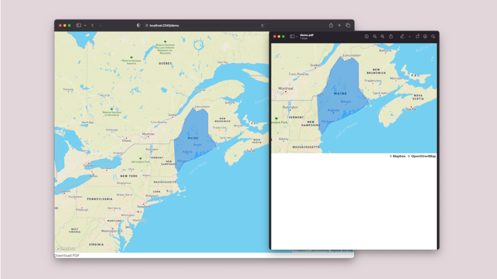 One last note: the map attribution must follow the map content wherever it goes, including in the PDF. You can do this manually by making use of the React-pdf Text component and copying the text of the Mapbox attribution element.