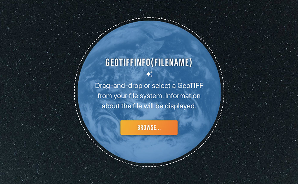 A more full-featured example of what you can do with Loam is embedded below. This application extracts metadata from a GeoTIFF and displays it to the user, and also displays the file’s bounding box on a map. To use it, drag a GeoTIFF into the pane below, or click the Browse button to select one from your file system. The file you submit will not be uploaded, so don’t worry about file size. If you don’t have a GeoTIFF handy, you can download one below.