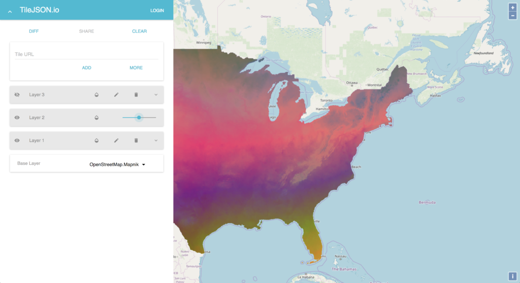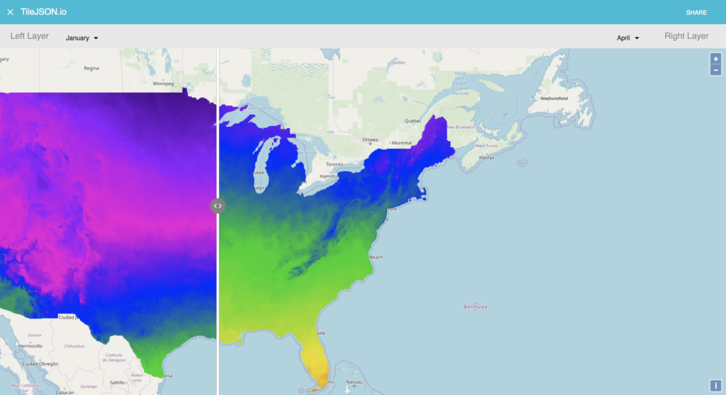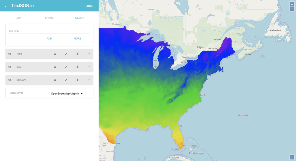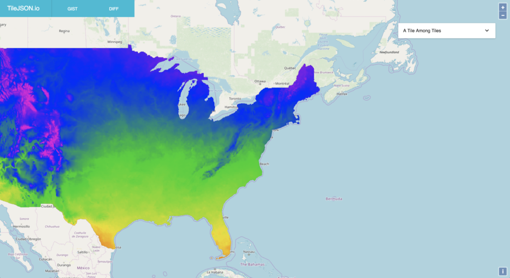 TileJSON is a JSON format for describing map datasets. The specifications for TileJSON were written up by Mapbox to encapsulate information about these types of tile set endpoints. While the specification is applicable to both raster and vector tiles, we focused on utilizing TileJSON for raster tiles in this first version. Our tool abstracts away the building of this TileJSON, so you can come in with just a tile URL and leave with (or share) TileJSON.