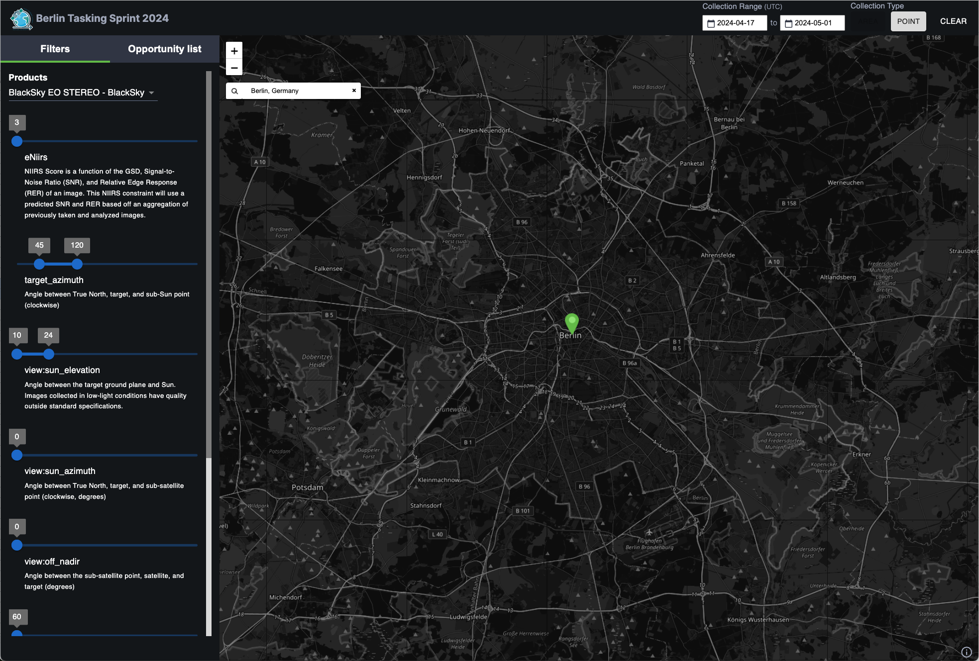 STAC (SpatioTemporal Asset Catalog) has established itself as a successful model for interoperability in the geospatial community. However, previous tasking sprints were all held in the US, limiting participation from other regions. With the aim of engaging a wider audience and fostering global collaboration, Berlin was an ideal location for our next sprint. Its central location in Europe made it easily accessible for many interested companies and individuals, allowing us to tap into a broader pool of voices and business models. Attending data providers (BlackSky, Satellogic, Open Cosmos, Umbra, Planet, EUSI, SatVu) provided insights into different business models, and data consumers and resellers (Up42, LiveEO) had experience with multiple APIs across providers.