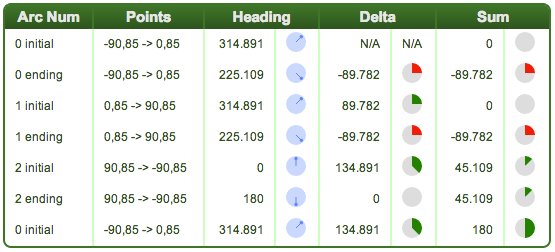 I keep track of which poles are covered as I’m calculating the course delta sum. You can determine which pole an arc crosses by looking at the initial and ending courses of the arc. If the arc’s initial course is 0 and ending course is 180 it crosses the North Pole. If the arc’s initial course is 180 and ending course is 0 it crosses the South Pole. The following table lists the course delta sums and which poles would be covered. Note that the values are approximate. The actual sums may be slightly off due to rounding errors.