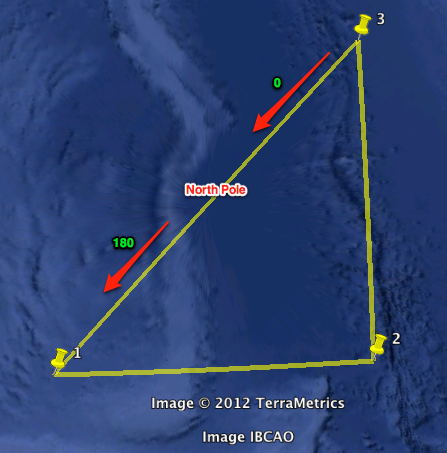 If the left turn amount is greater than 180 it’s shorter to turn clockwise to get to the new heading than to turn counter clockwise. I subtract 360 degrees in this case returning a negative number. The difference between the angles is exactly 180 degrees with a point on the pole or an arc crossing the pole. If you were in an airplane flying along the polygon border you would head straight towards the North Pole, fly over it, and then head directly away from the pole. From the North Pole’s perspective you have changed direction 180 degrees. This makes determining the delta difficult because I can’t determine whether to go with +180 or -180. I need to know which way you turned to suddenly change direction so drastically.