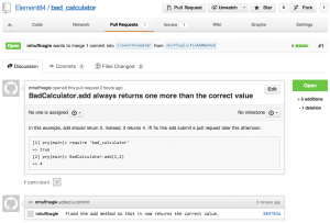This step is where hub earn its pay. Everything that we’ve done so far could have been done through the Github website and/or git on the command line. The one thing that you can’t do, though, is attach a pull request to an issue. I’m not sure why Github doesn’t let you specify an issue number when you create a pull request on the site, but they don’t. Fortunately for us, hub makes it really easy. Our issue number is “1″ in this case, so we’ll run the following command to create a pull request and associate it with issue number 1: